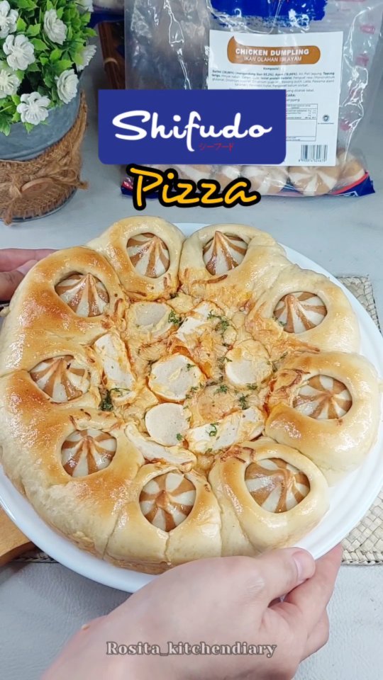 - Tusuk garpu bagian tengahnya, oles dg saus pizza, tambahkan Shifudo Fish Tofu & Bakso Ikan, keju leleh, parsley, oven suhu 200 derajat selama 20-30 menit. Angkat dan sajikan.